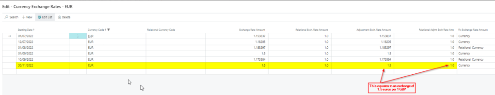 Next, I set the month end rate of 1.5 in the Currency Exchange Rate page. This is the rate I want to revalue the bank account ledger entries at the end of month.
