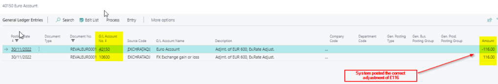 If we look at the General Ledger entries the Exchange Rate Adjustment has created, we can see this is exactly what has happened.