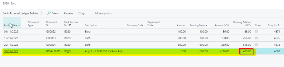 Finally, I run the “Adjust Exchange Rate” batch job with a posting date of 30/11/22 and added a few additional filters to revalue the bank account ledger entries.