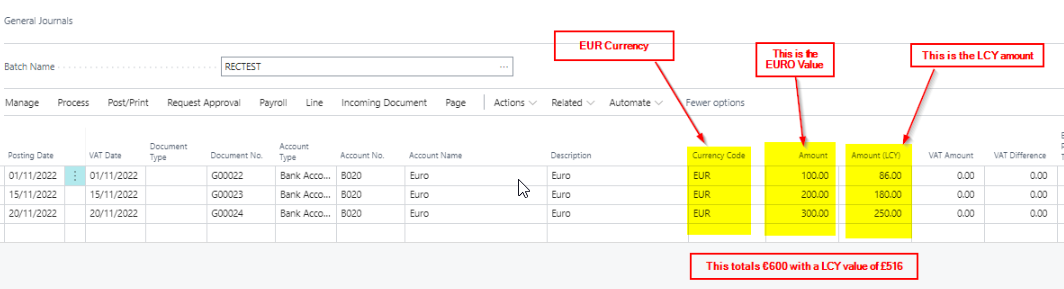 In this scenario my local currency (LCY) is GBP and I have a EURO bank account with several transactions that I wish to revalue at month end using a rate of 1.5.