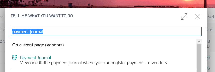 In order to pay these documents I’ll be using the “Payment Journal” which can be found by clicking the search option and typing “Payment Journal”