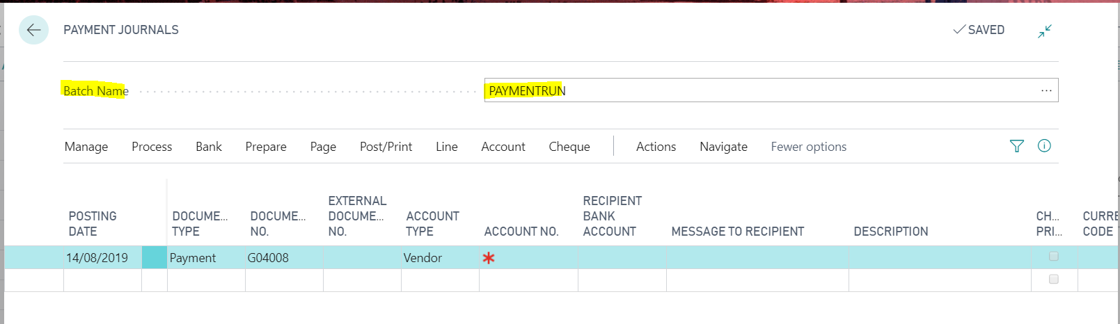 Once in the “Payment Journal” page the first thing to select is the batch. As you can see I’ve selected one called PAYMENTRUN