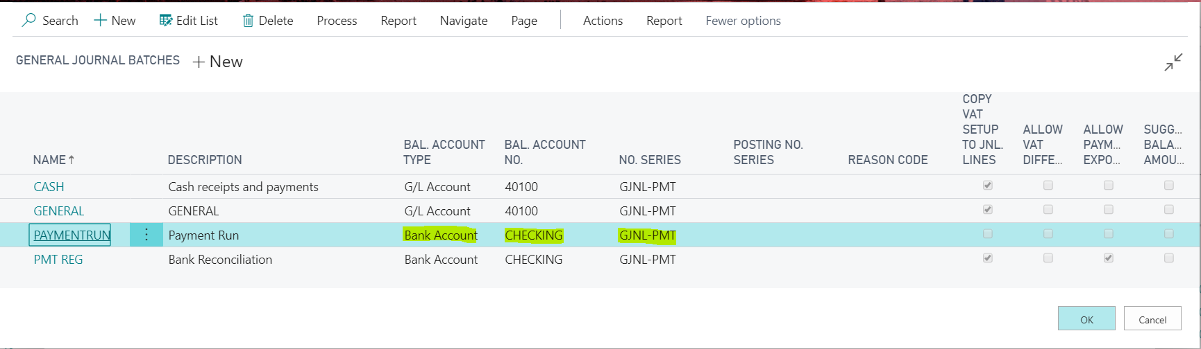 If we drill down on the batch you can see it determines the balancing account and also the number series to use. I’ve select “Bank Account” as the balancing account so the system will create “Bank Account Ledger Entries” that I can later reconcile via the bank reconciliation.