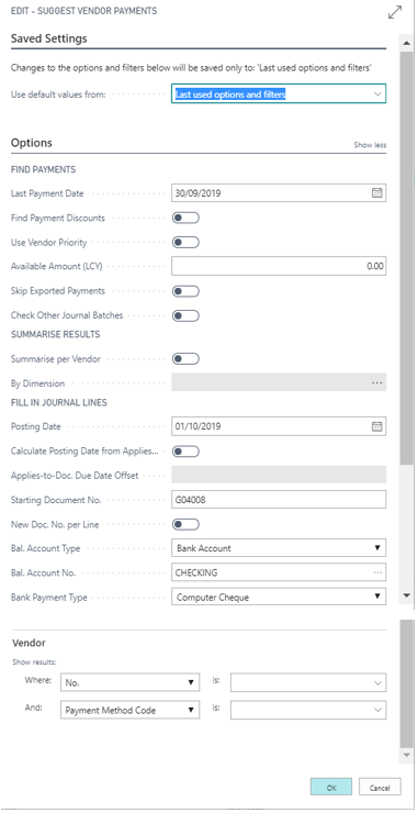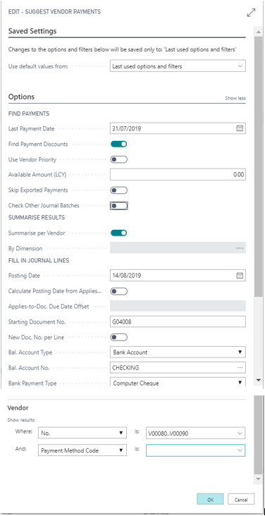 Vendor No:- I’ll be entering a range of V00080..V00090 as I only want to pay those two vendors