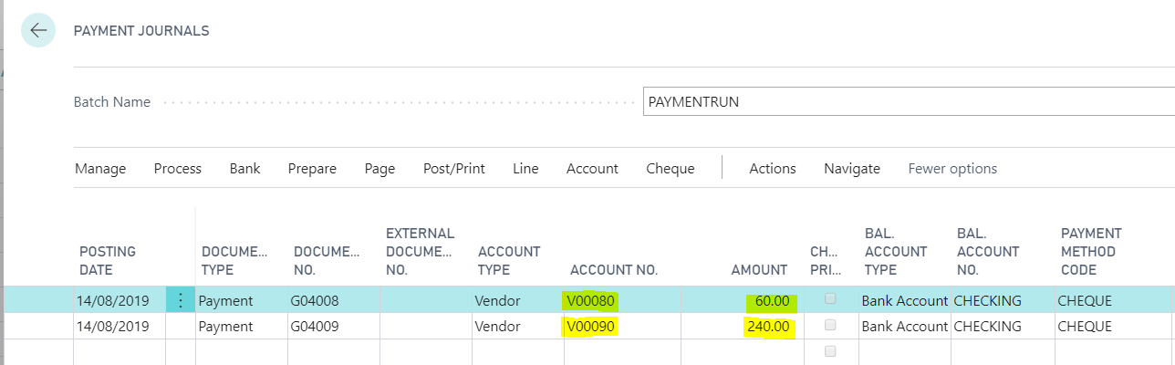 As you can see the system has generated a Payment for Vendor V00080 of £60.00 and a Payment for Vendor V00090 of £240.00