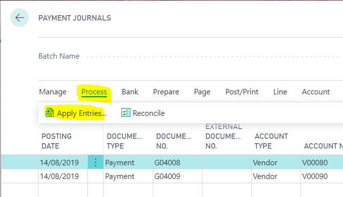 To view the invoices that have been applied on the payment you click “Process > Apply Entries”