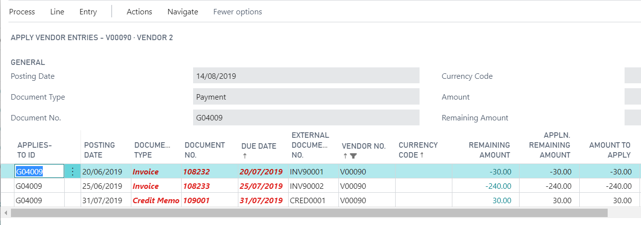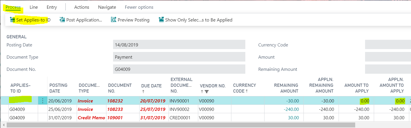 Next I’m going to remove INV90001 from the payment run as I’m not ready to pay this Invoice just yet. To do this I’ll highlight the line and click “Process > Set Applies-to-ID”. Doing this blanks out the “APPLIES-TO-ID” field and also sets the “AMOUNT TO APPLY” and “APPLN. AMOUNT TO APPLY” to £0.00 on the invoice as per below