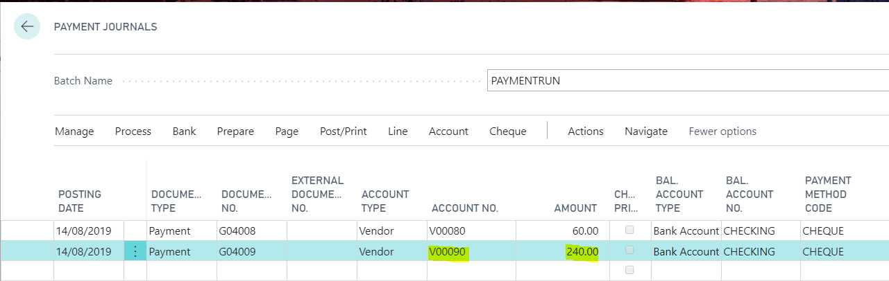 As you can see I have two invoices on vendor V00080 with a total of £180.00 and two invoices and one credit note on V00090 giving a total of £240.00.