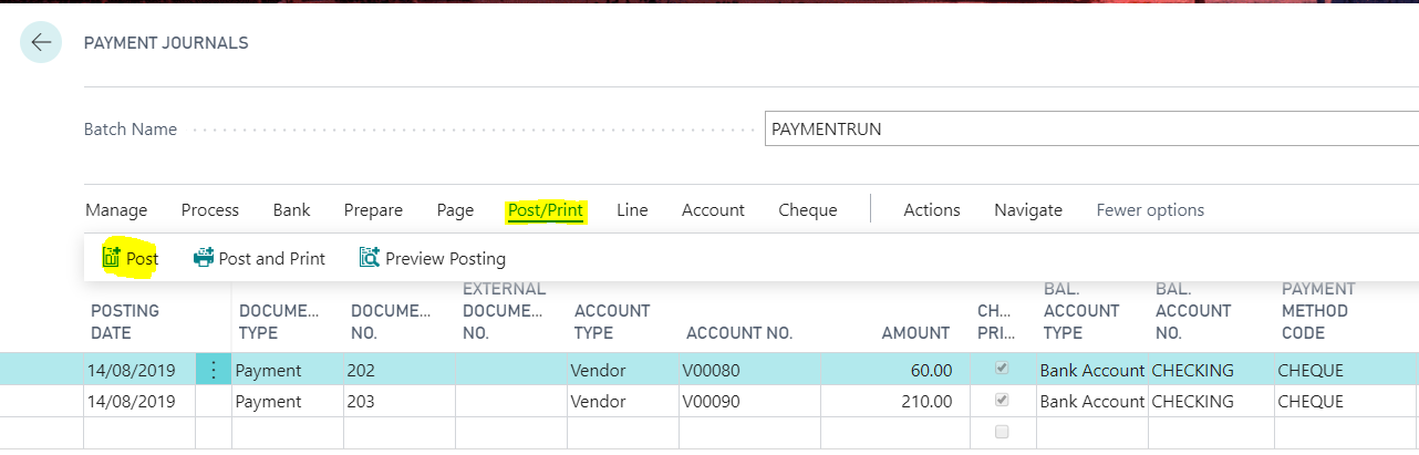 Once you have printed the cheques and are ready to post you can just click “Post\Print> Post” as per below
