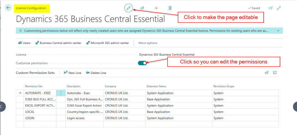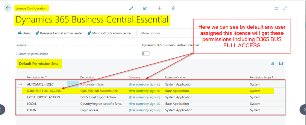 I’ll configure the permissions for the “Dynamics 365 Business Central Essential” licence. To do this I click on the hyperlink for this licence and it opens the page.