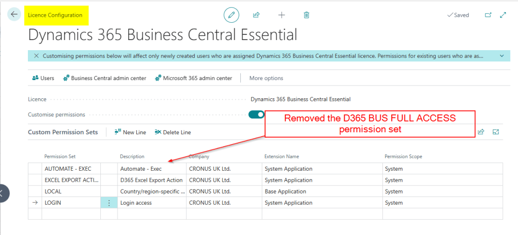 We can now change the permissions. I’m just going to remove the “D365 BUS FULL ACCESS” permission set. To do this I highlight the line and click “Delete Line”