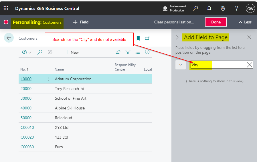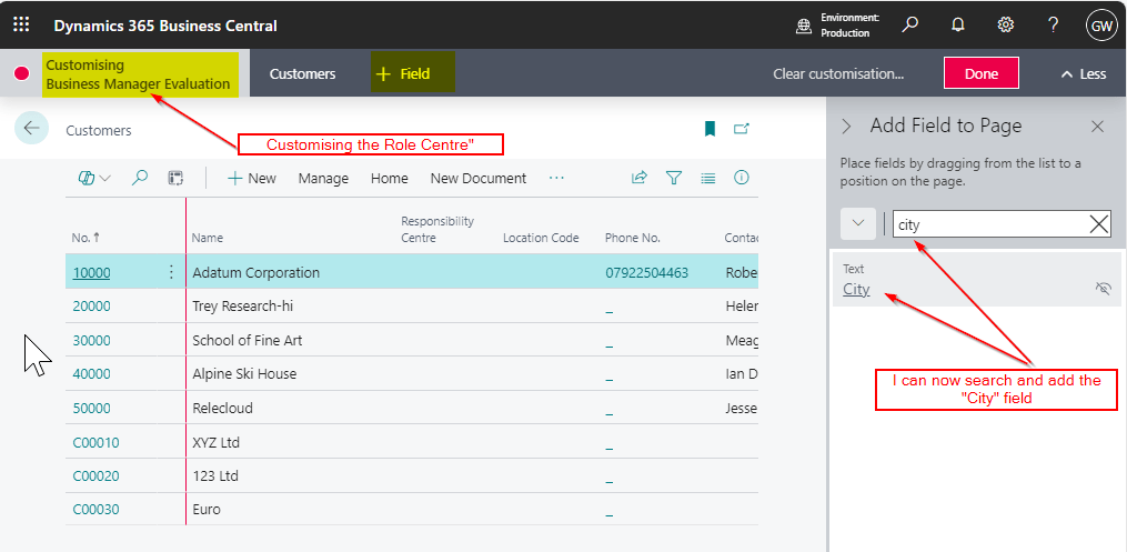 For example, to add the “City” field to the Customer List page, I just need to determine which Role Centre Iโm using and customise the page from there.