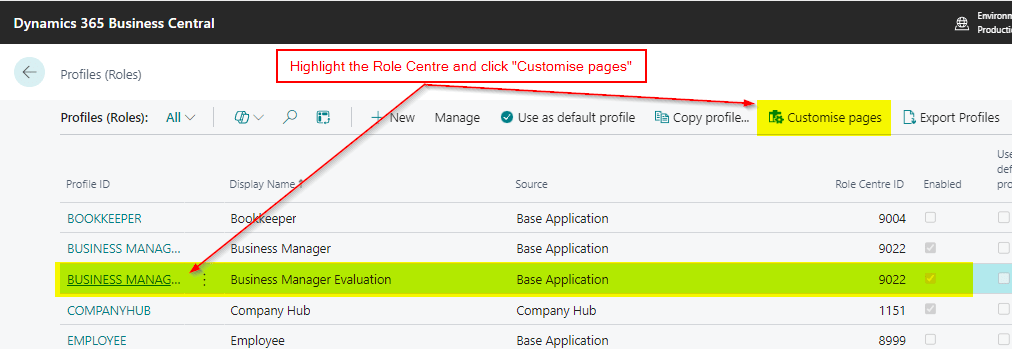I can then locate that Role Centre on the “Profiles (Roles) page and click “Customise pages”