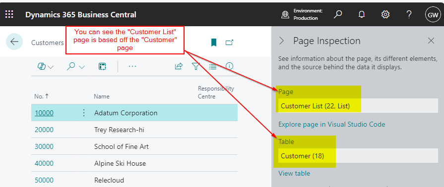 Every page in Business Central is based on a table, which you can verify using the “Page Inspector” tool. For instance, on the Customer List page, pressing CTRL+ALT+F1 reveals that it is built on the “Customer” table.