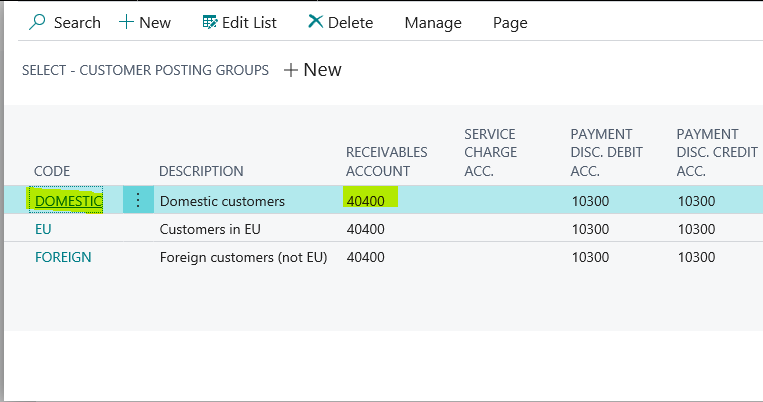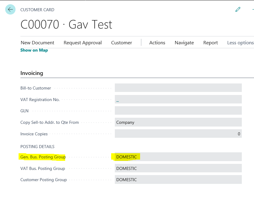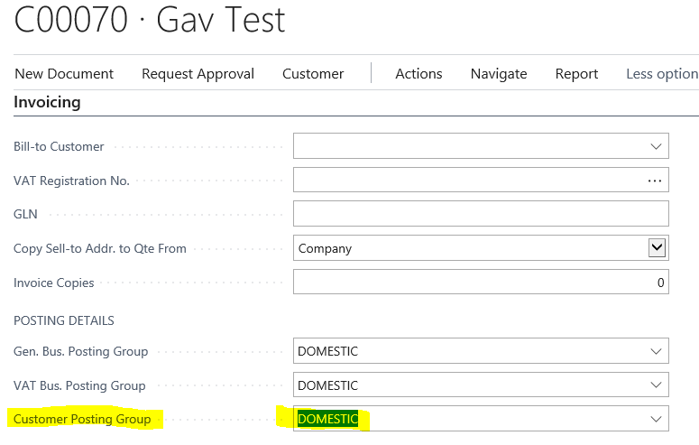 Specific posting groups are used to default the control accounts. For example, I’ve assigned the specific Customer Posting Group “DOMESTIC” to the customer below: