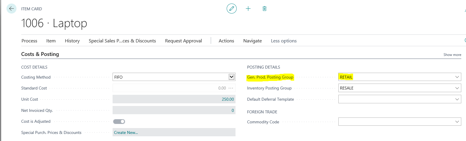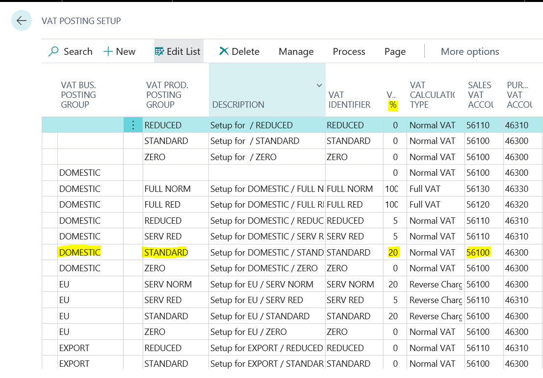 Prod. Posting Group used on the Item is “STANDARD” the VAT percentage used