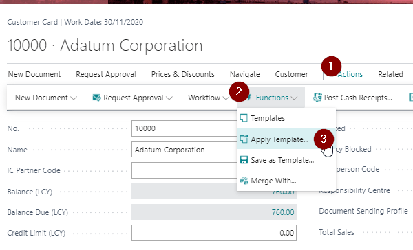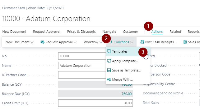 To do this I can select “Actions > Functions > Templates” when in a customer page.