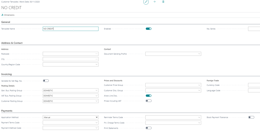 In this page I can set things like default payment terms, currency codes and also posting groups for GL codes.