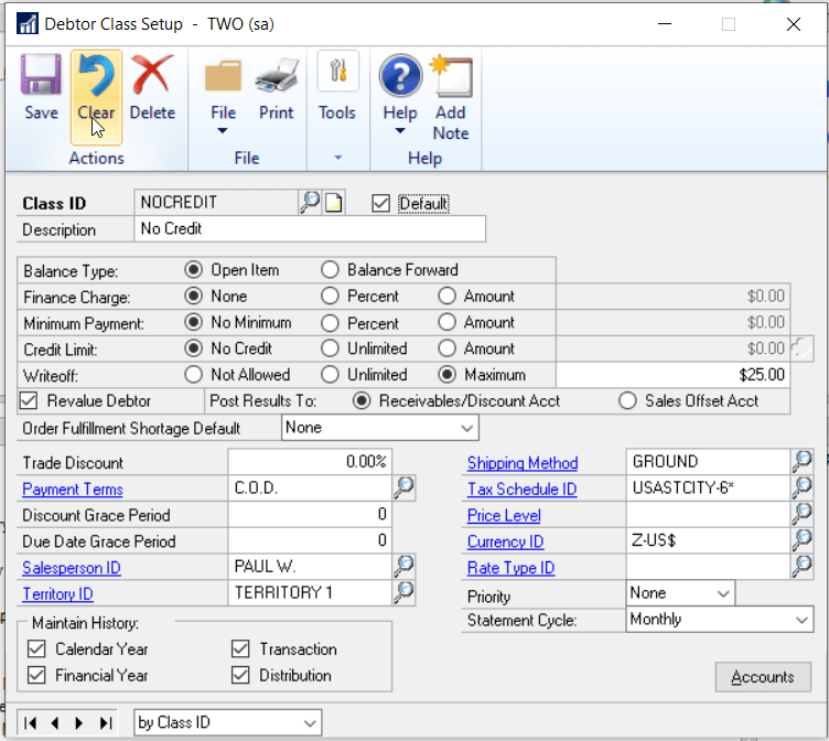The difference with Dynamics GP is the Class ID stays with the customer enabling you to group certain debtors and run reports based on certain Classes whereas the template is just used to copy information to the customer.