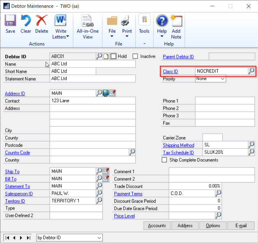 You can then make any tweaks to the customer setup after the settings from the Class have been copied. For example you may wish to have slightly different discount on this debtor to what was on the Class ID.