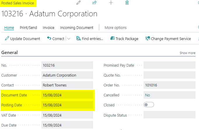 As you can see below the Posted Sales Invoice has the incorrect Document and Posting Date of the 15th of August