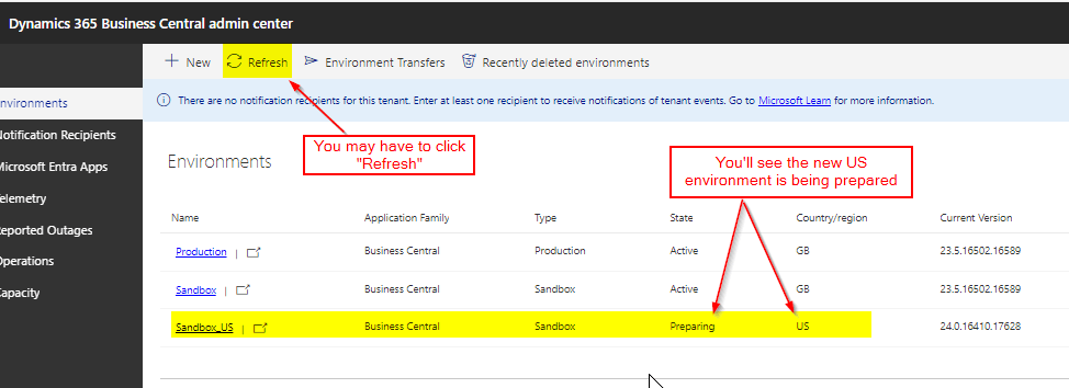 Enter an Environment Name, select the “Type” as “Sandbox” and select the “Country” as “US”.