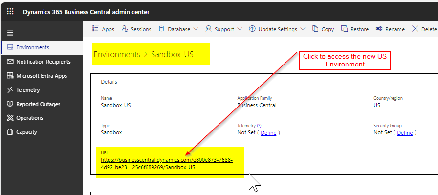 Once the Sandbox is Active you can click the “Sandbox_US” link and then the URL to access the Sandbox: