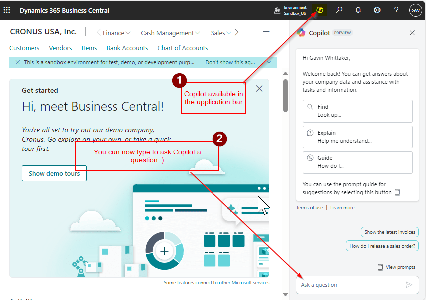 The 2024 wave 1 update of Business Central introduces the new “Chat with Copilot” feature. However, at the moment, this is only available in the US localisation of Business Central.