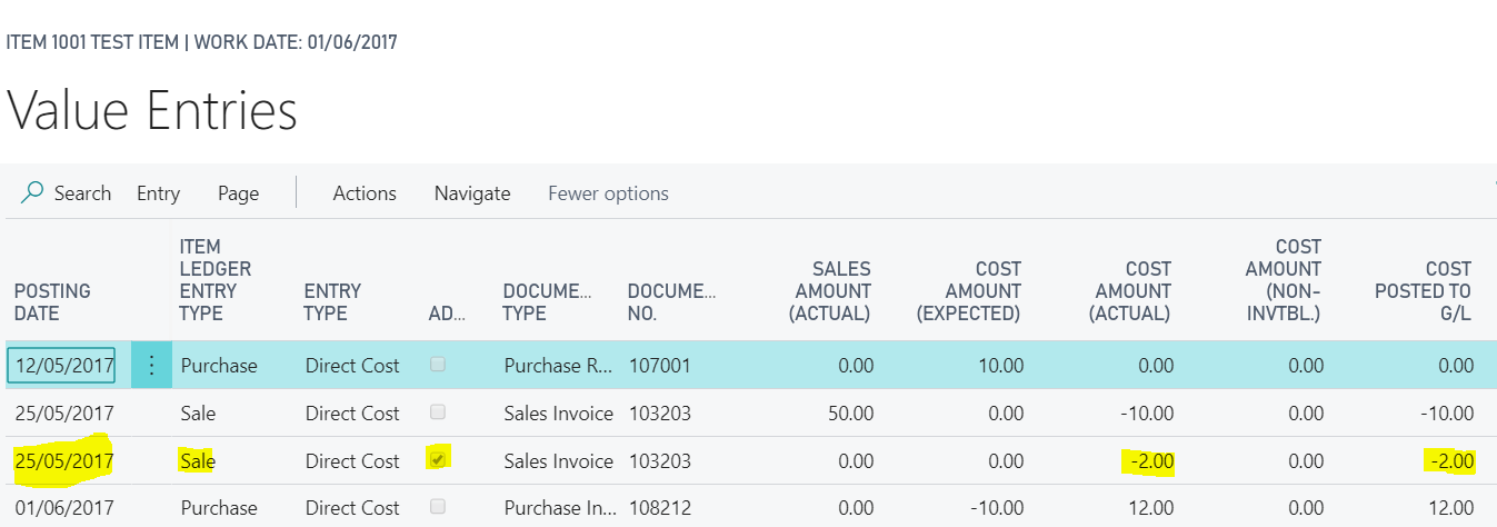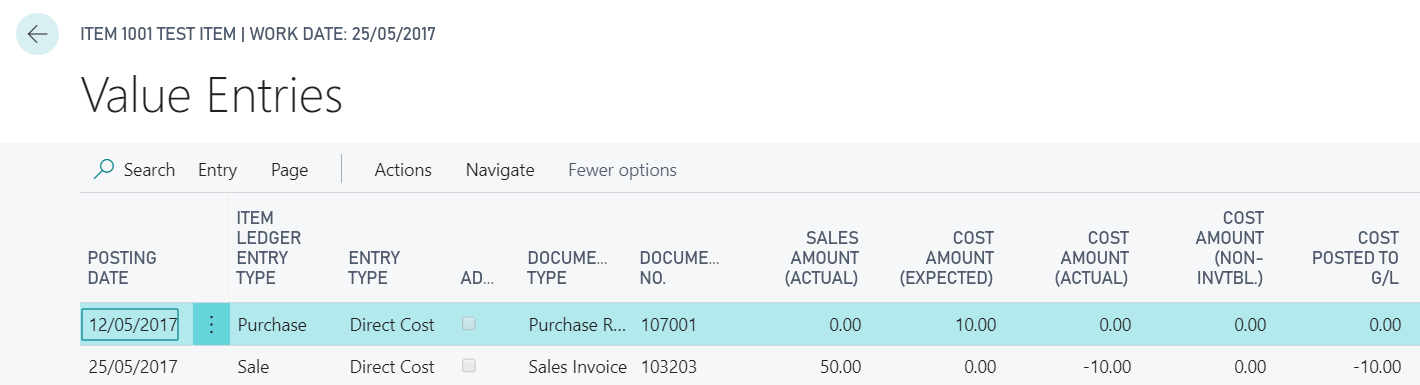 And if we drill down on the “Sales Amount (Actual)” to the Value Entries we can see the two value entries. One is the original Sales Invoice and the other the Item Charge we just posted:
