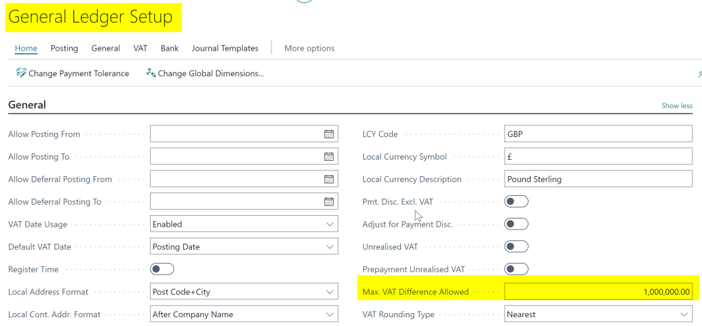 We first do this by setting the “Max. VAT Difference Allowed” in the General Ledger Setup. I’m going to set this to 0.20 which means I’m allowed to change the VAT by up to £0.20p